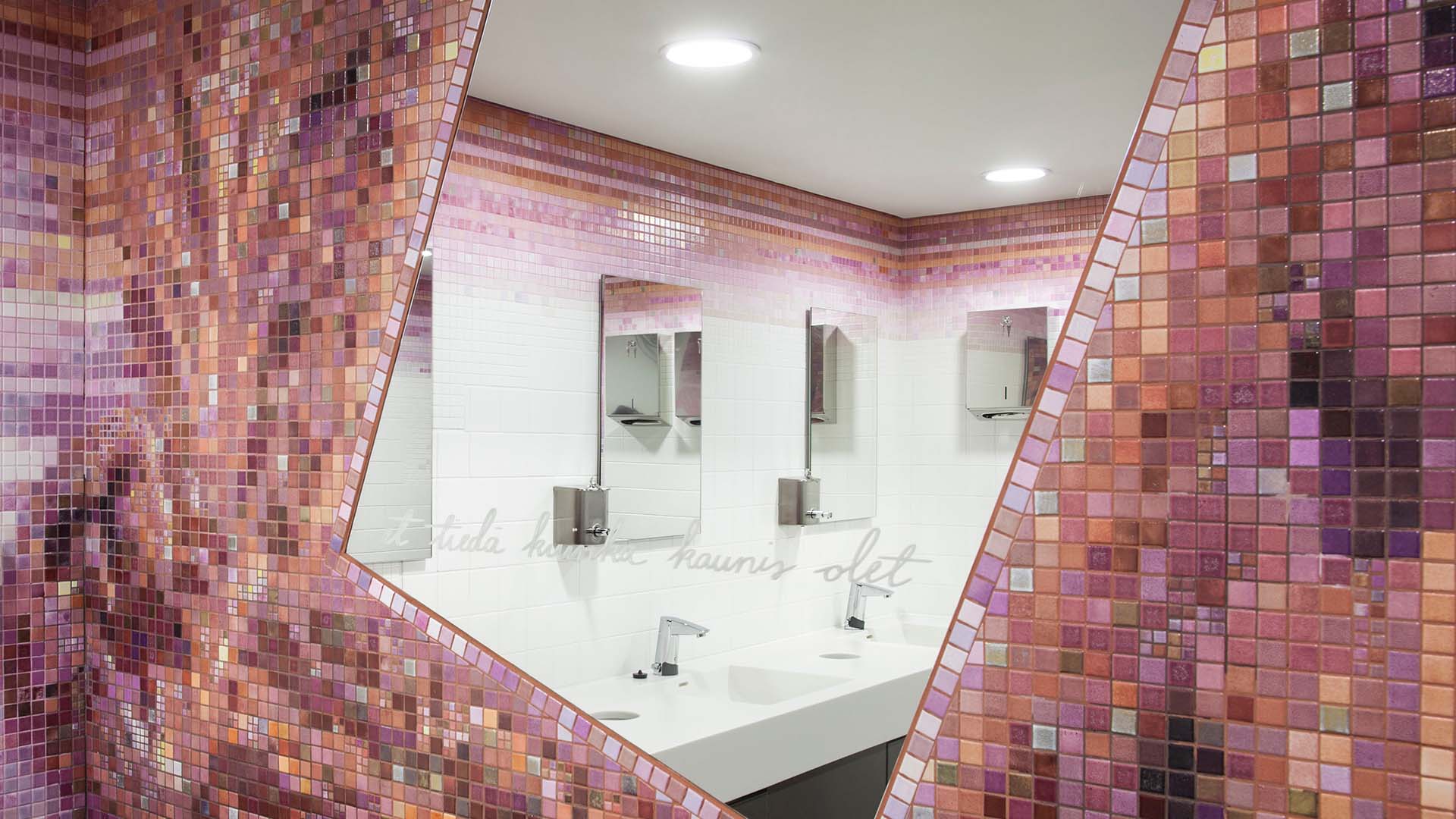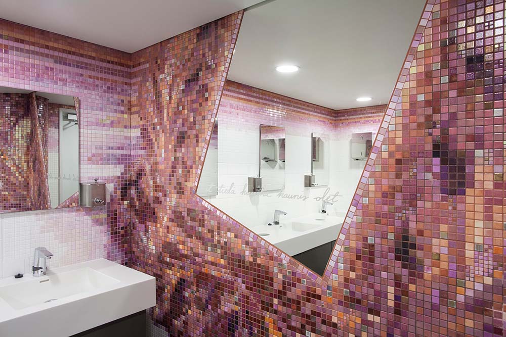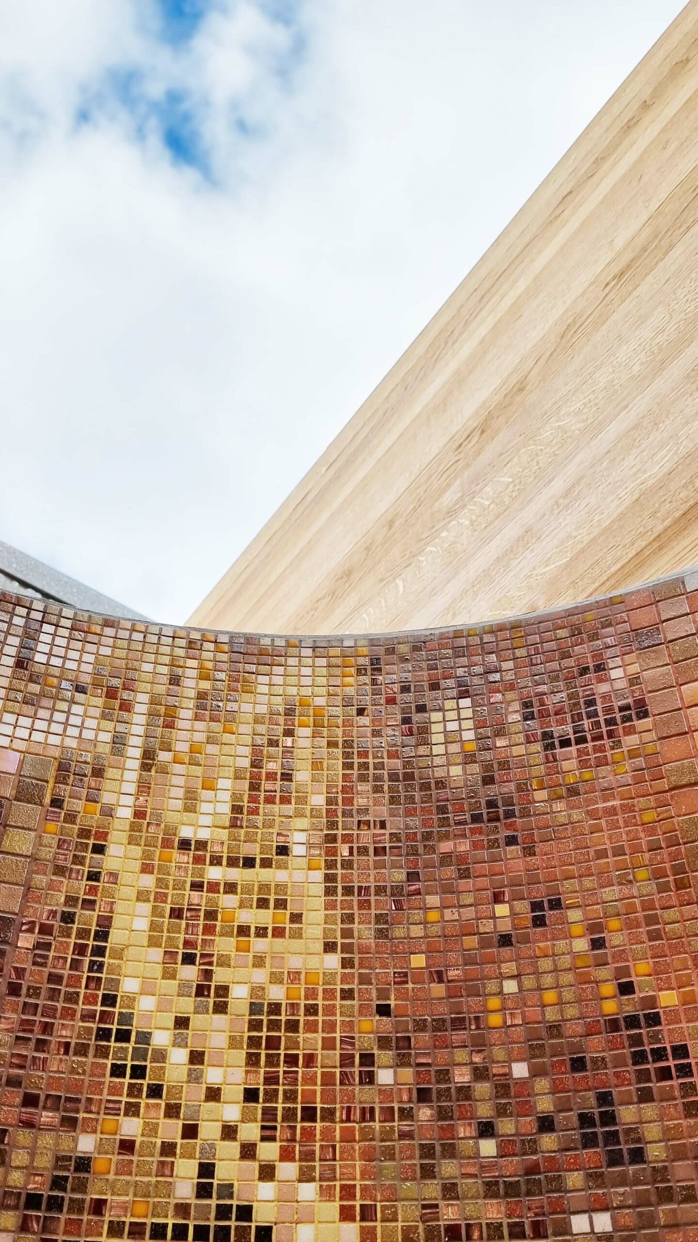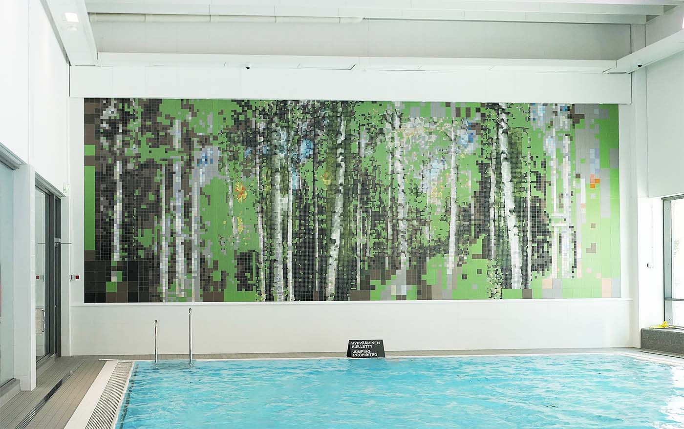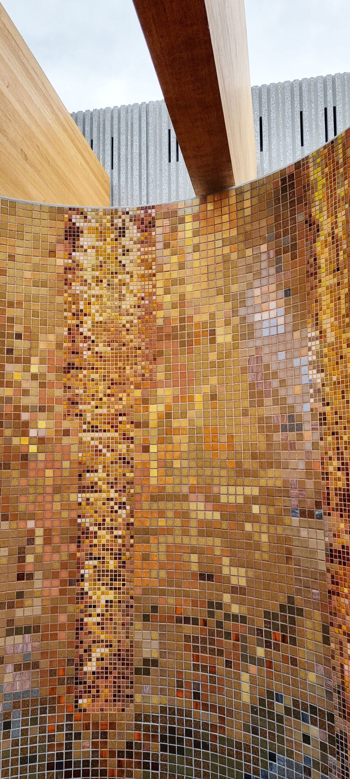 After the summer sauna, people often sit and look at the lake surface. From the embrace of steam, we move into the embrace of nature. In this mosaic the pine trees gilded by the evening sun are reflected on the rippling surface of the water. A source of inspiration has also been Akseli Gallen-Kallela’s small painting “Landscape from Kuhmo” from 1890, which is part of the museum’s collections.