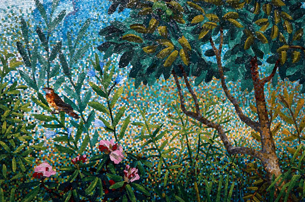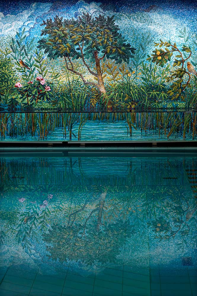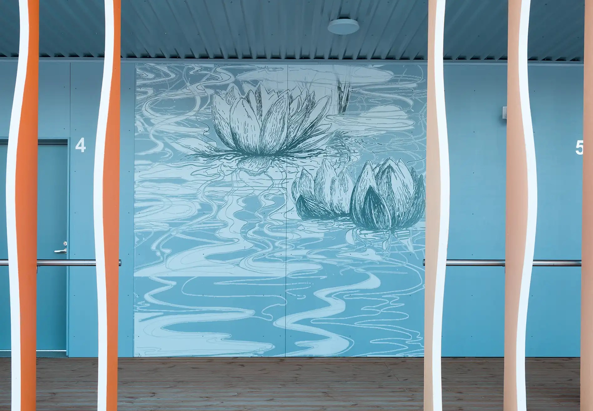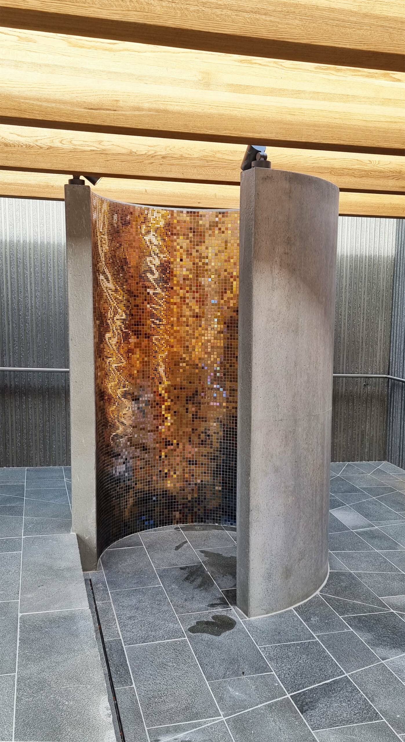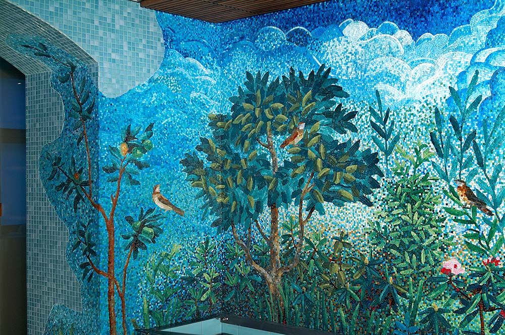 After the summer sauna, people often sit and look at the lake surface. From the embrace of steam, we move into the embrace of nature. In this mosaic the pine trees gilded by the evening sun are reflected on the rippling surface of the water. A source of inspiration has also been Akseli Gallen-Kallela’s small painting “Landscape from Kuhmo” from 1890, which is part of the museum’s collections.