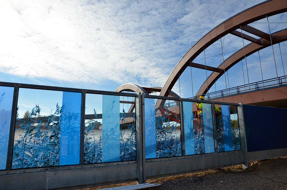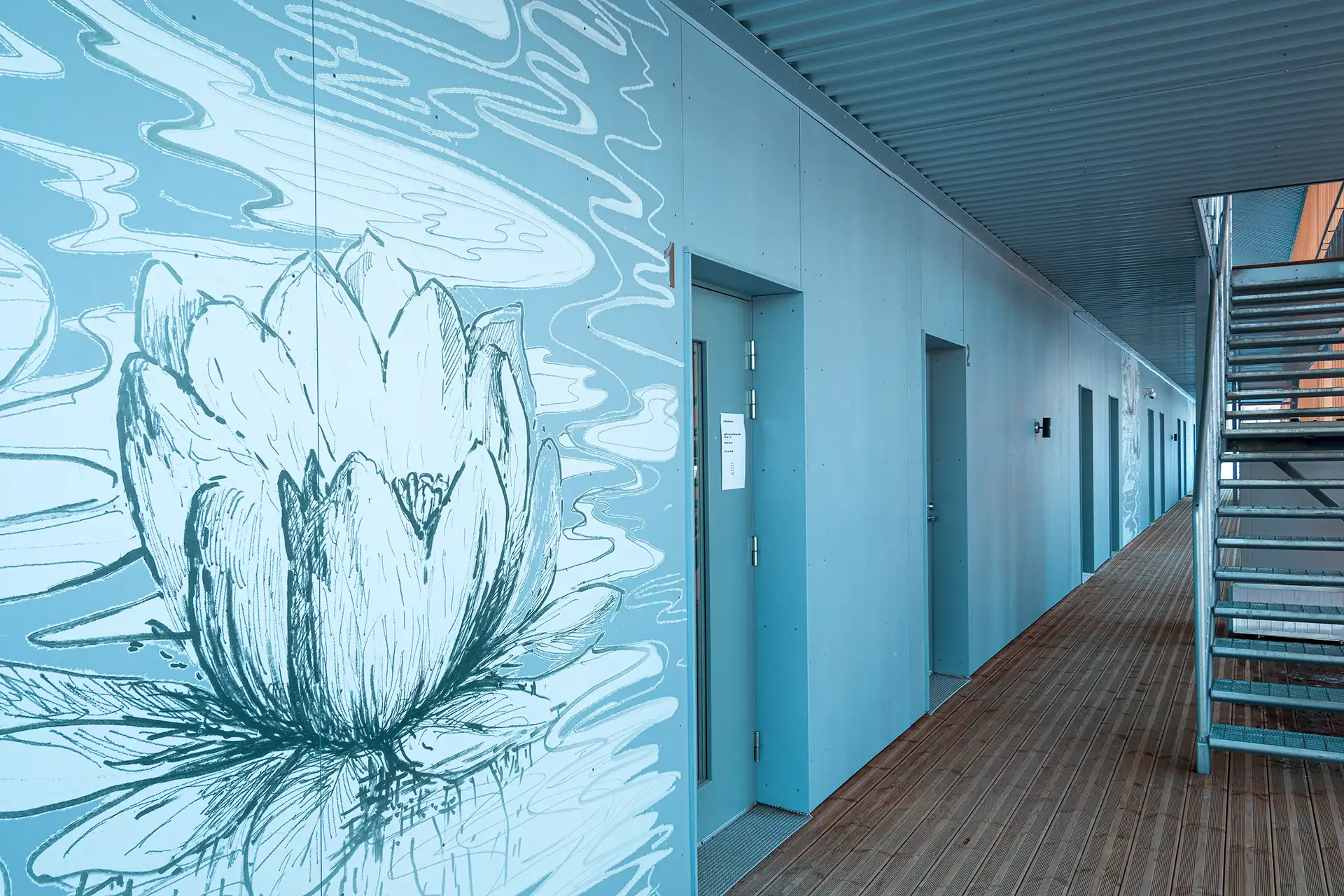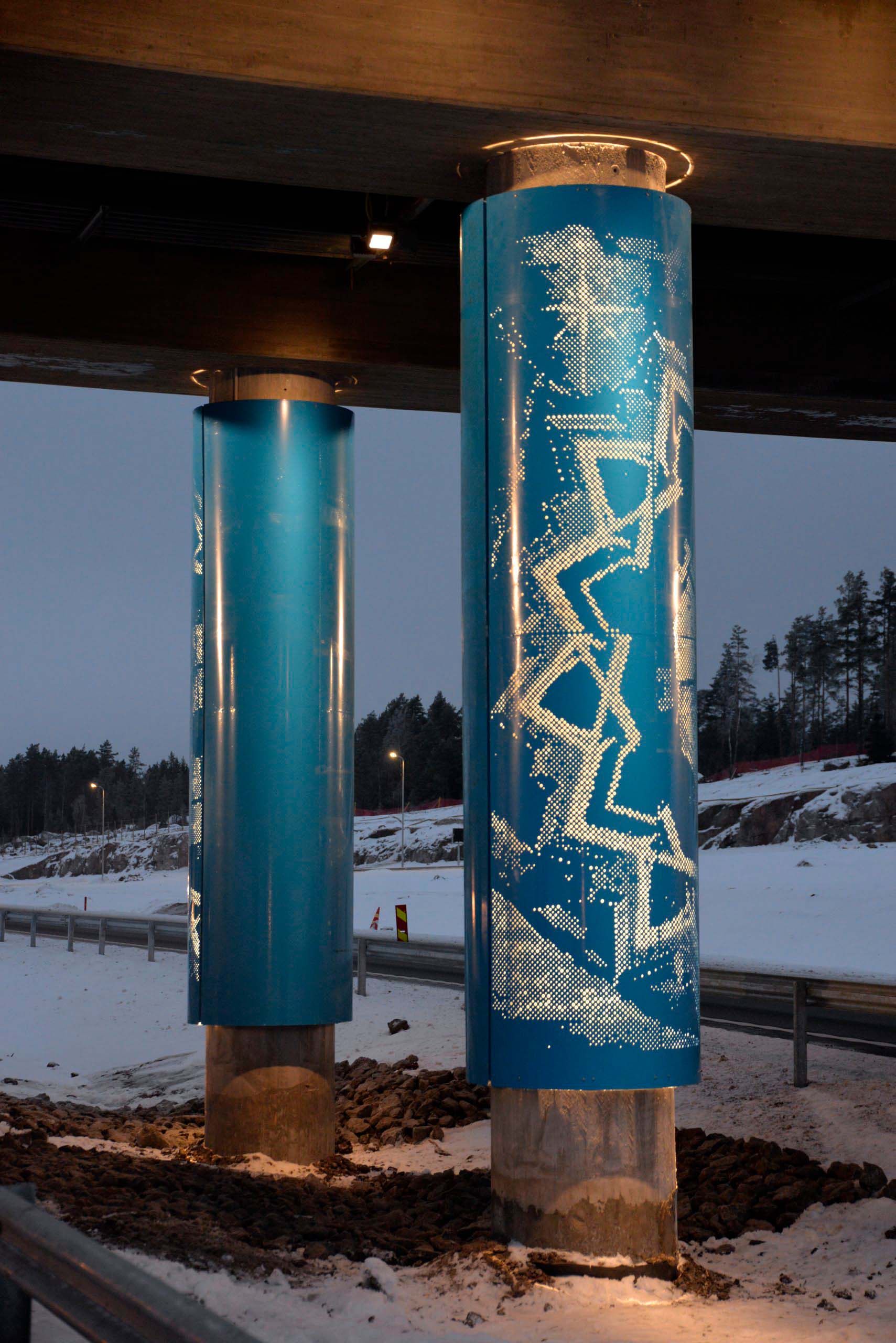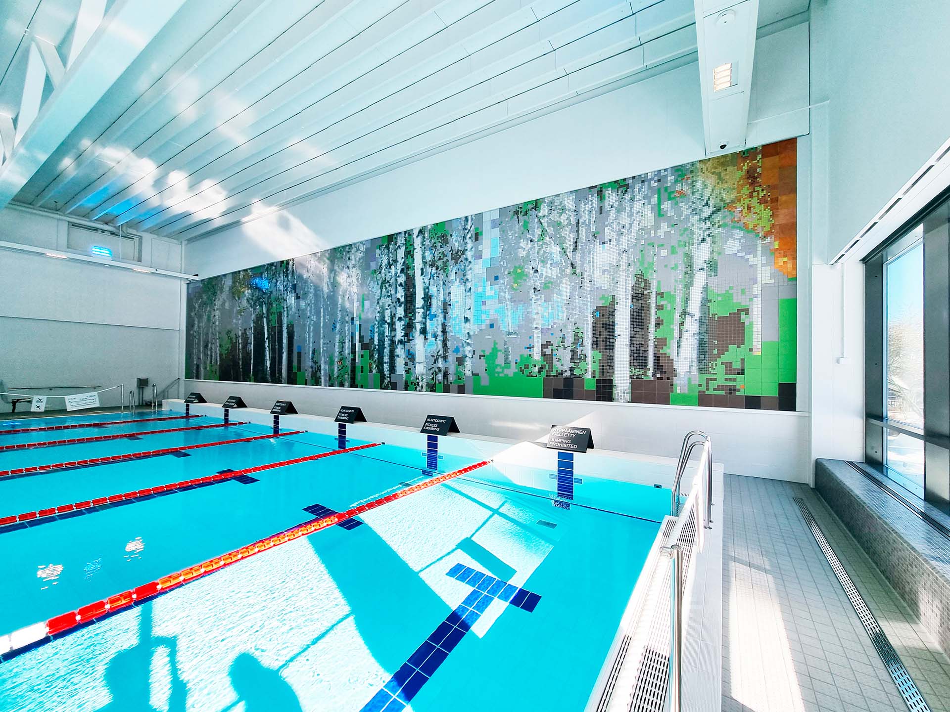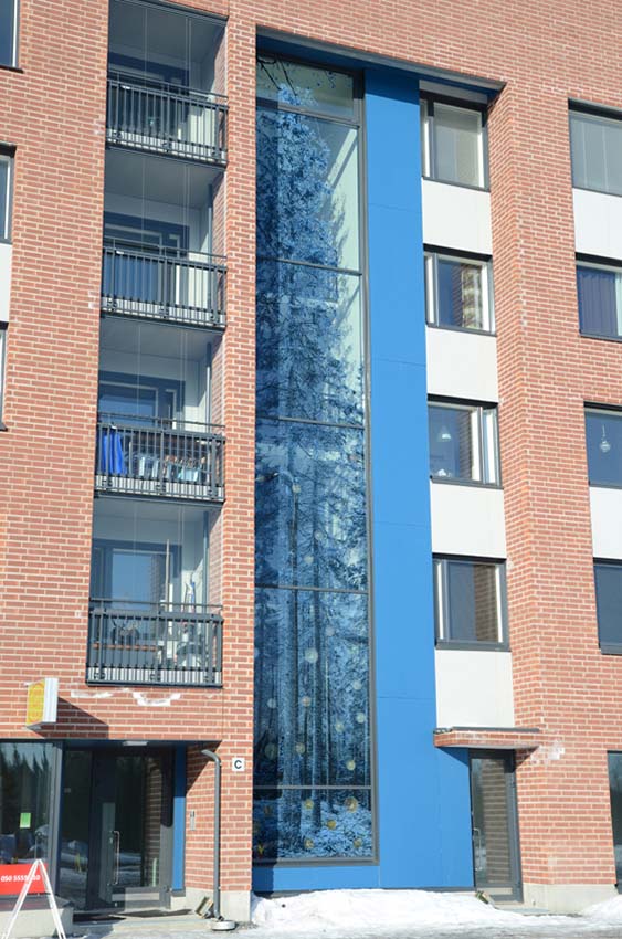 After the summer sauna, people often sit and look at the lake surface. From the embrace of steam, we move into the embrace of nature. In this mosaic the pine trees gilded by the evening sun are reflected on the rippling surface of the water. A source of inspiration has also been Akseli Gallen-Kallela’s small painting “Landscape from Kuhmo” from 1890, which is part of the museum’s collections.