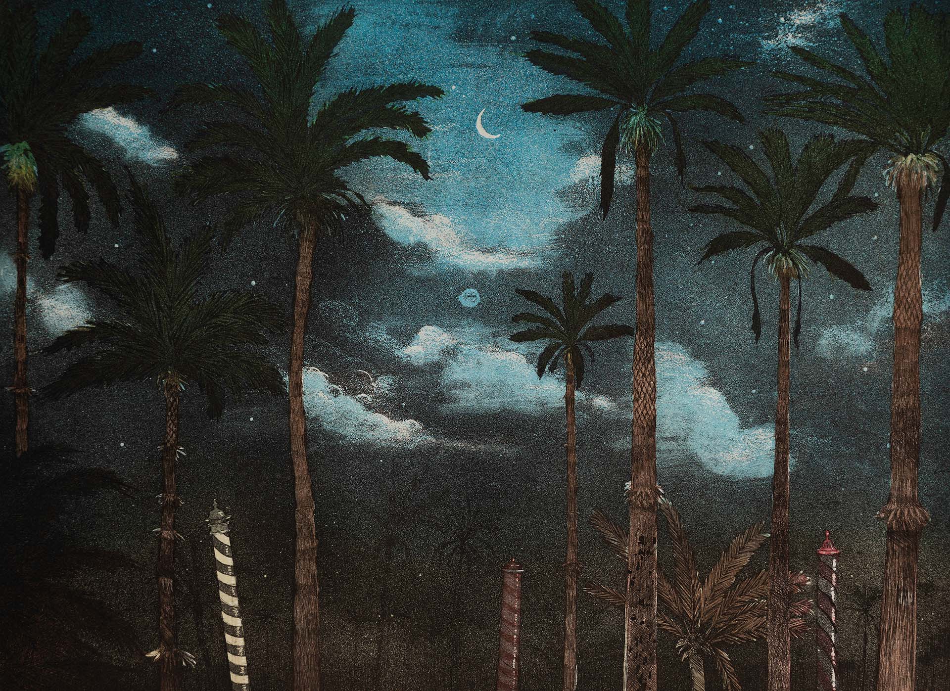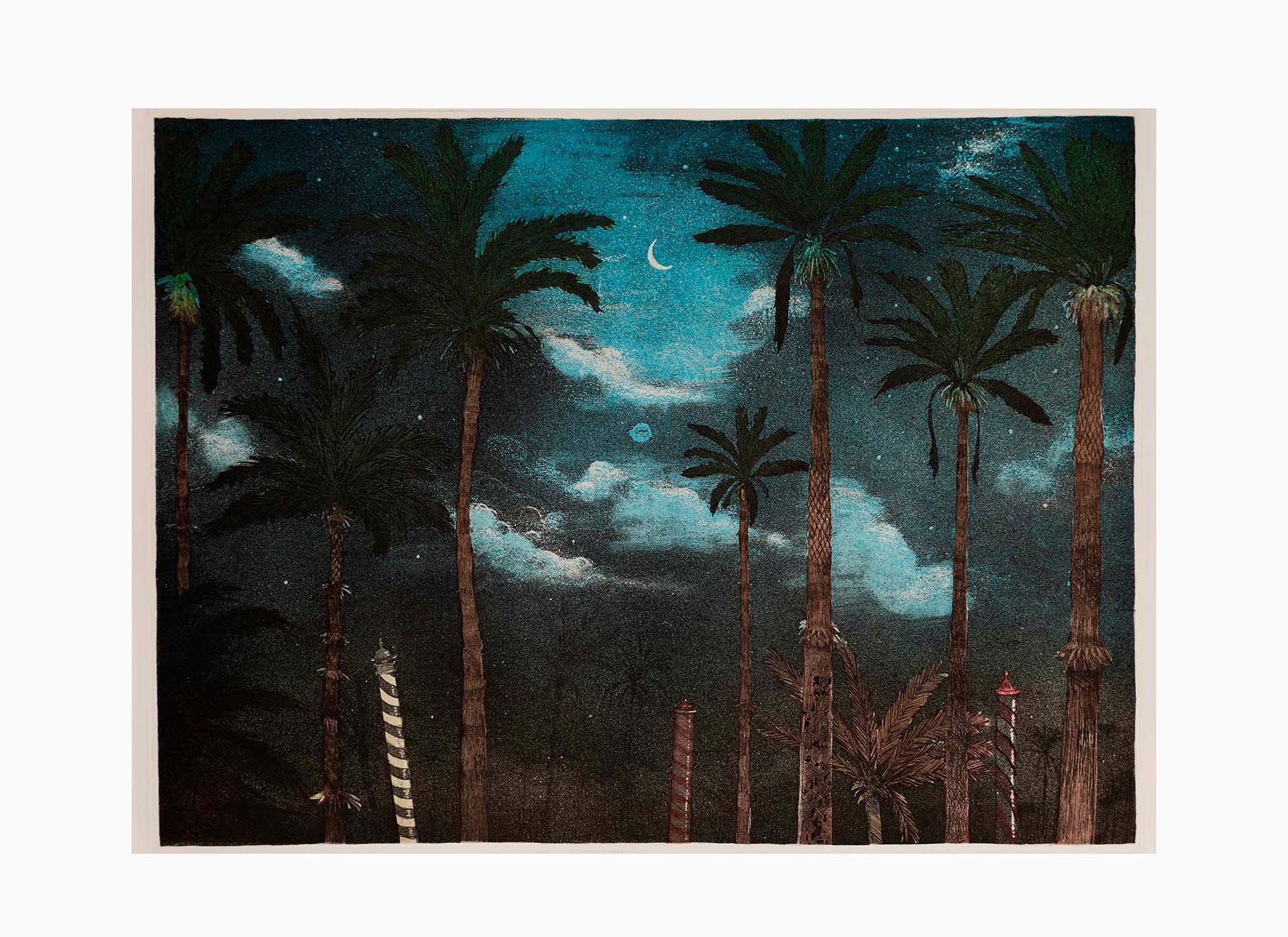 The egyptian motifs in Lehtinen’s oeuvre were followed by works featuring the garden of her childhood home and pictures of tents and gardens inspired by her trips to Italy and Egypt. She produced pictures of gardens with palm trees and of tropical plants and birds. Gradually, the focus in Lehtinen’s art moved more and more towards Italy. She got to work in prestigious Italian printing studios. From her journeys, Lehtinen has brought back new ways of printmaking and working methods to Finland.